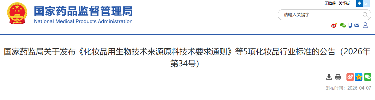 国家药监局组织起草的《化妆品用生物技术来源原料技术要求通则》等5项化妆品行业标准(见附件),经国家药监局化妆品标准化技术委员会主任会议审查通过,现予以发布。上述5项行业标准为推荐性标准,自2027年5月1日起实施。