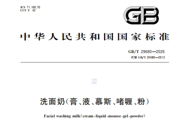 2026年2月27日,国家市场监督管理总局(国家标准化管理委员会)发布新版国家标准GB/T 29680-2026《洗面奶(膏、液、慕斯、啫喱、粉)》。该标准将全部代替现行的GB/T 29680-2013《洗面奶、洗面膏》标准,并于2026年9月1日起正式实施。